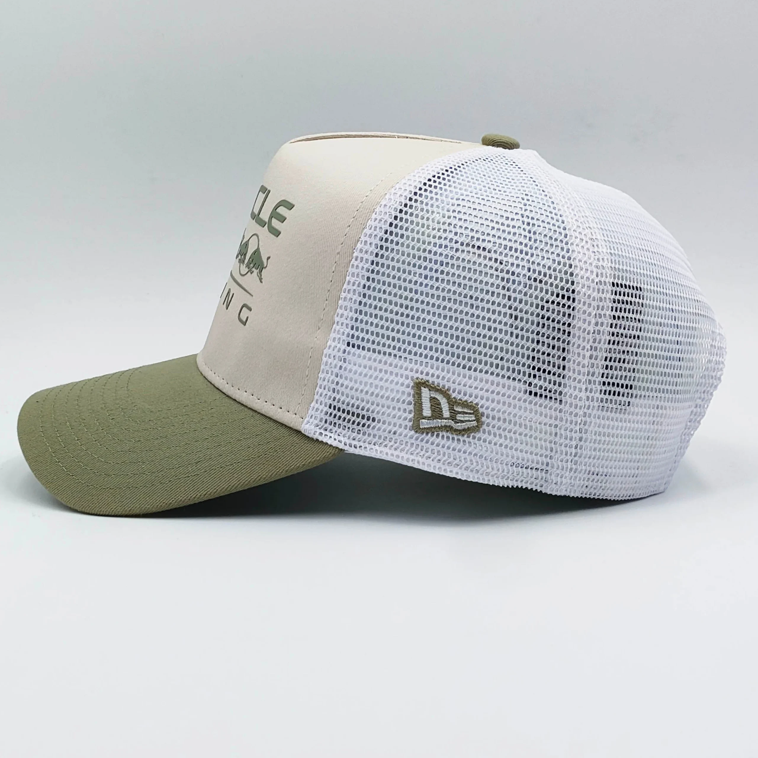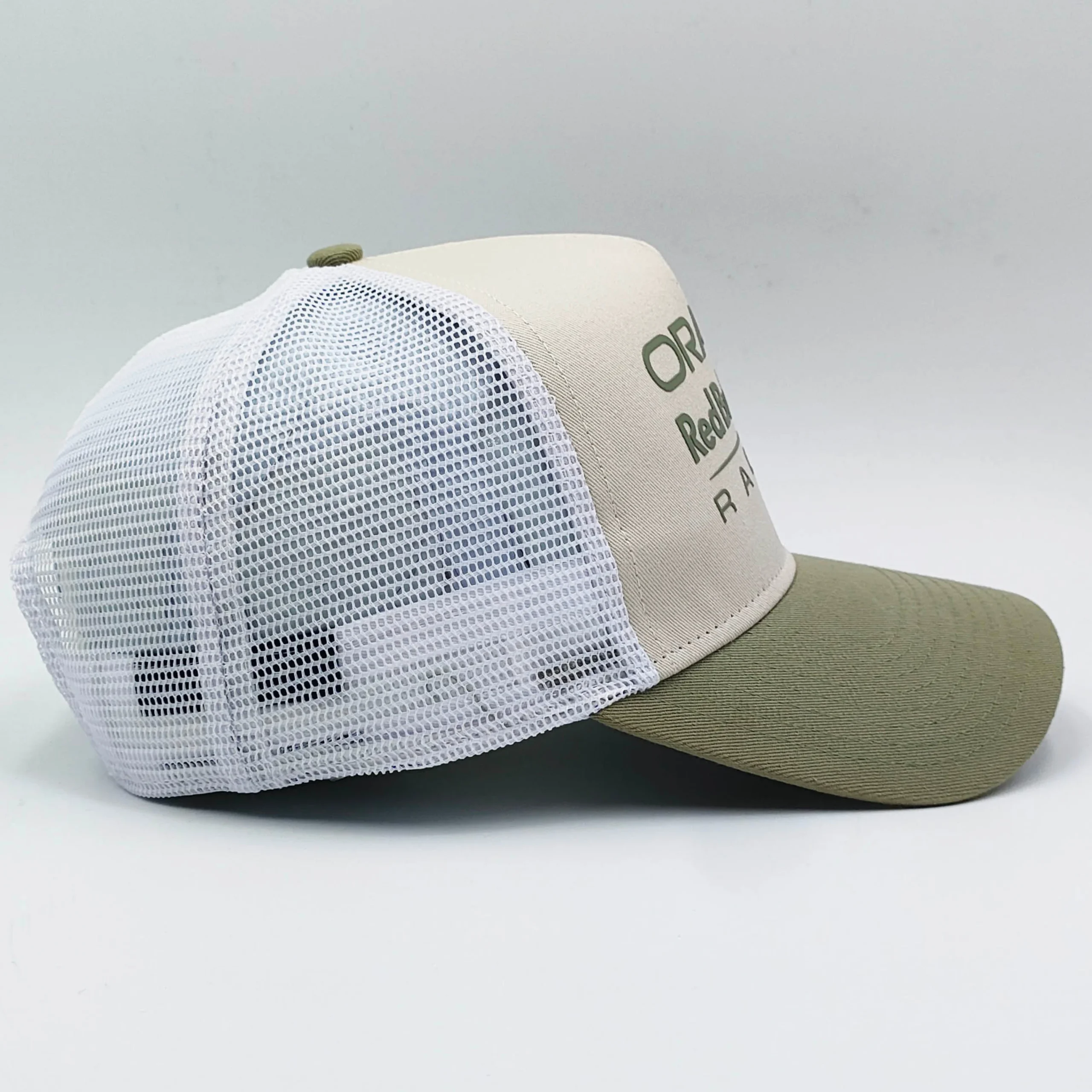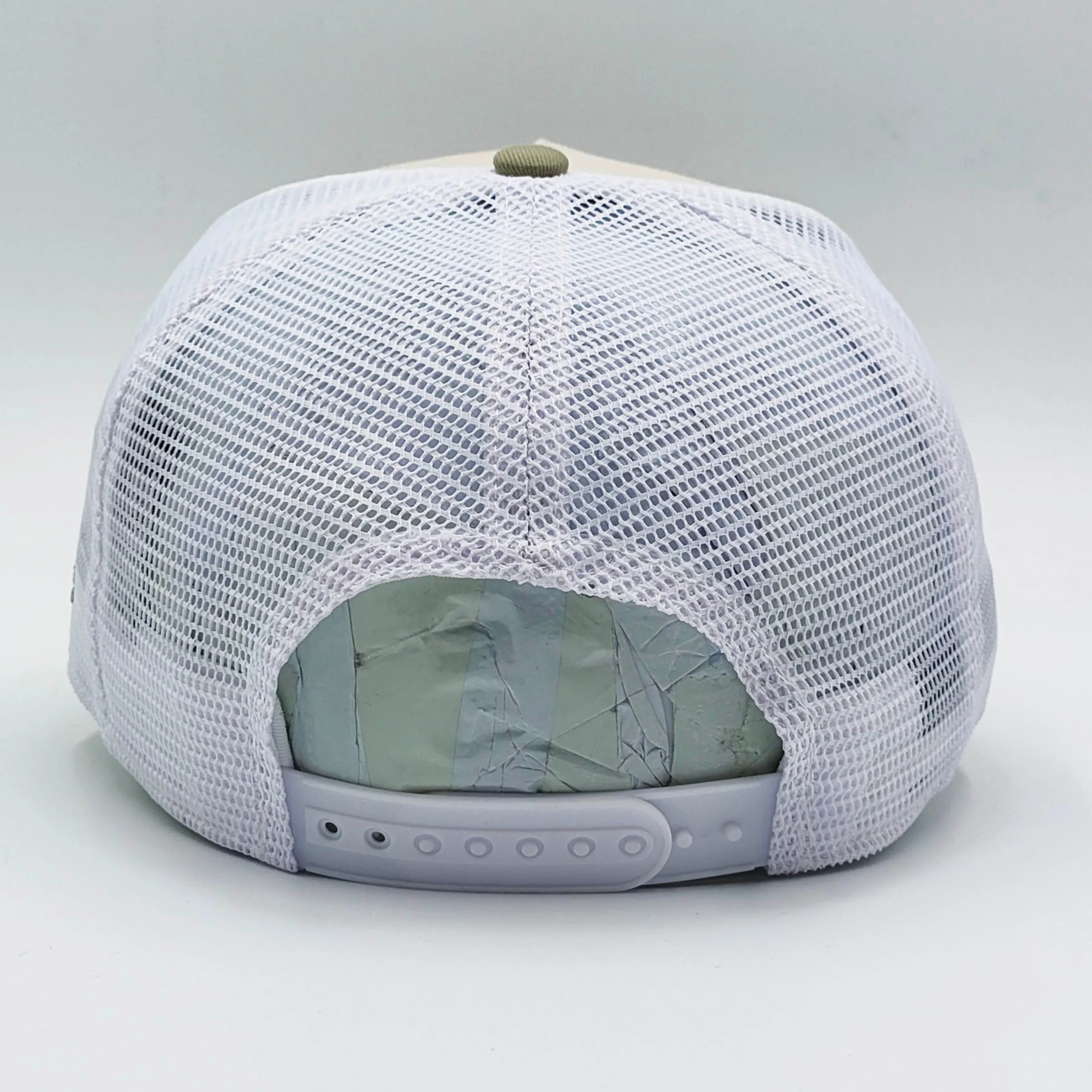 - Breathable white mesh trucker design